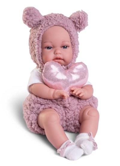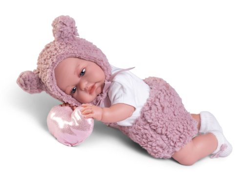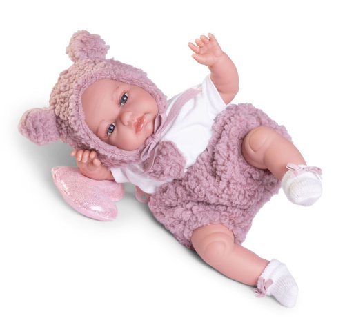 Ručne vyrobená realistická španielska bábika - bábätko, so špeciálnou pohybovou funkciou. Vďaka vnútornej opore kostry tela, môže robiť neobvyklé pohyby končatín, ako prekrížiť nožičky v ľahu, dať k sebe dlane alebo zaujať rôzne bábätkovské polohy. Bábätko má mäkké látkové telo, hlava a končatiny sú vyrobené z kvalitného mäkčeného vinylu. Oblečenie niektorých bábik bolo vyrobené z organickej bavlny, ktorá zaručuje výrobu z ručne zbieranej, ekologicky bez chemického ošetrenia pestovanej bavlny. Firma Antonio Juan kladie veľký dôraz na ekológiu a preto ako prvá využíva v tomto odvetví spomínanú bavlnu. Veľkosť 34 cm. Balené v darčekovej krabici. Odporúčaný vek od 3 rokov.