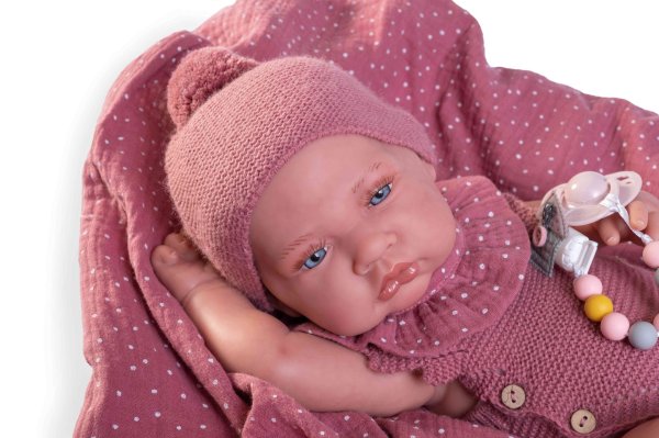 Ručne vyrobená realistická španielska bábika - bábätko Reborn s niektorými ručne dokresľovanými detailmi ako sú: vlásky, nechtíky, žilky, obočie, červenkastá pokožka v záhyboch atď. Jeho telíčko má špeciálnu úpravu kože, aby bola ľahko ochmýřená. Nesmie sa dostať do kontaktu s vodou vzhľadom na ručnú maľbu a použitie akrylových farieb. Má certifikát o pôvode - rodný list a váži 1090 gr. Bábika je vyrobená zo špeciálneho mäkčeného vinylu, veľmi príjemného na dotyk. Oblečenie niektorých bábik bolo vyrobené z organickej bavlny, ktorá zaručuje výrobu z ručne zbieranej, ekologicky bez chemického ošetrenia pestovanej bavlny. Firma Antonio Juan kladie veľký dôraz na ekológiu a preto ako prvá využíva v tomto odvetví spomínanú bavlnu. Veľkosť 42cm. Balené v darčekovej krabici. Táto bábika nie je klasickou hračkou pre malé deti, odporúčaný vek od 14 rokov.