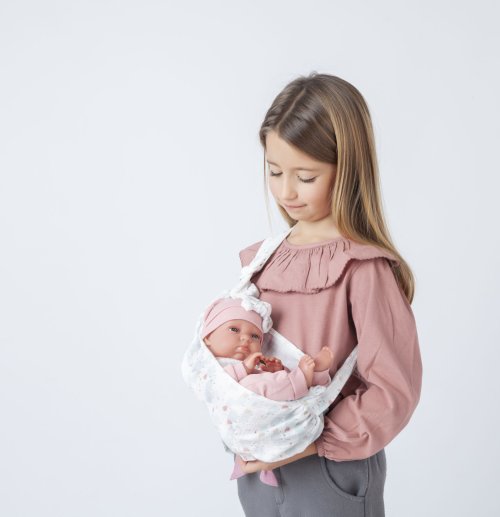 Ručne vyrobená realistická španielska bábika - bábätko Môj malý Reborn s niektorými ručne dokresľovanými detailmi ako sú: nechtíky, obočie, miesta záhybov atď. Bábätko nie je klasickým Rebornom, ale má niektoré jeho vlastnosti. Nesmie sa dostať do kontaktu s vodou vzhľadom na ručnú maľbu a použitie akrylových farieb. Má certifikát o pôvode - rodný list a váži 685 gr. Bábika má mäkké látkové telo, hlava a končatiny sú vyrobené z kvalitného mäkčeného vinylu. Oblečenie niektorých bábik bolo vyrobené z organickej bavlny, ktorá zaručuje výrobu z ručne zbieranej, ekologicky bez chemického ošetrenia pestovanej bavlny. Firma Antonio Juan kladie veľký dôraz na ekológiu a preto ako prvá využíva v tomto odvetví spomínanú bavlnu. Veľkosť 33 cm. Balené v darčekovej krabici. Odporúčaný vek od 3 rokov.