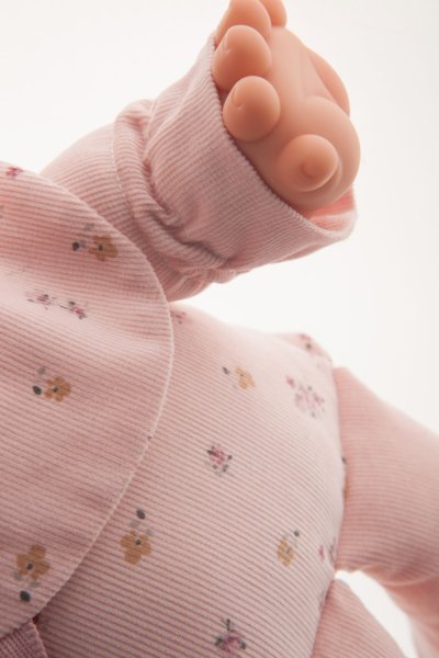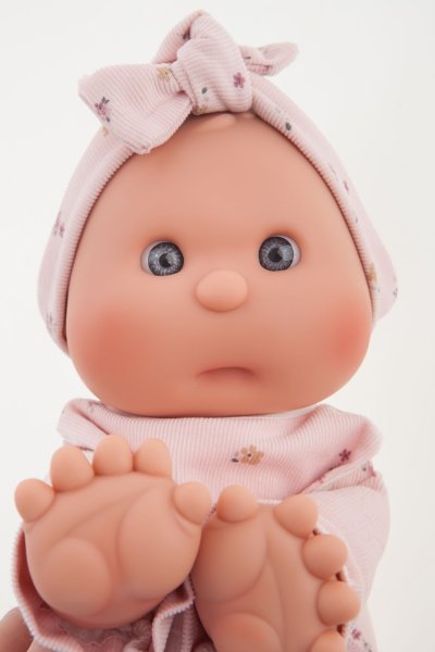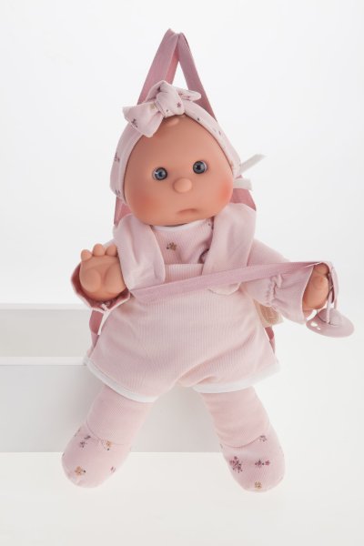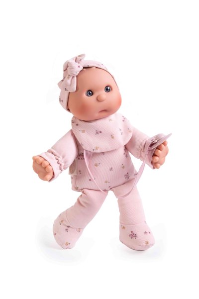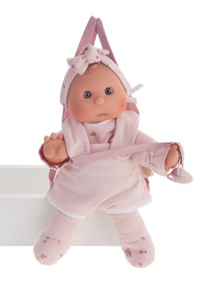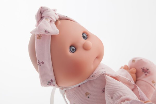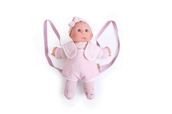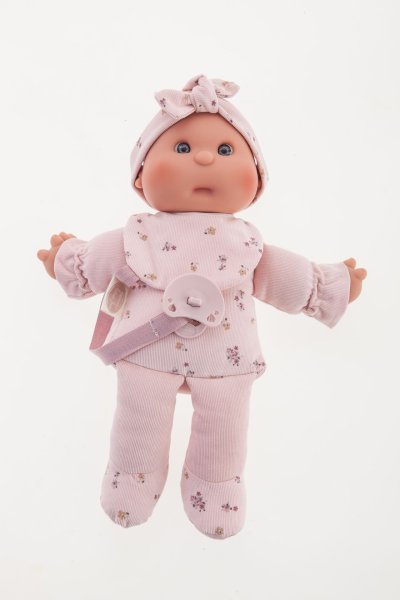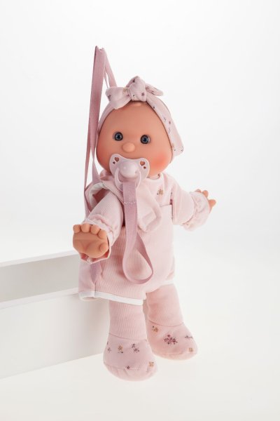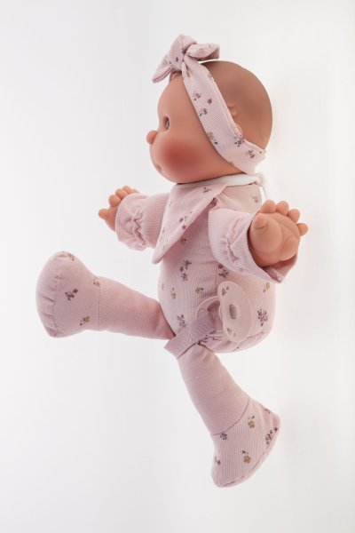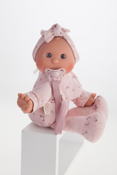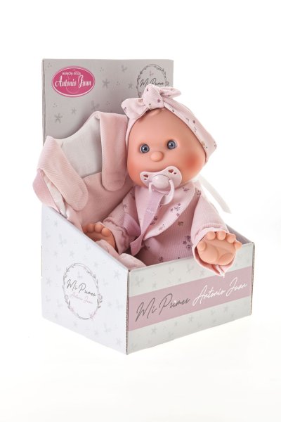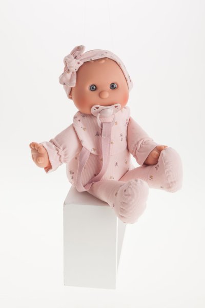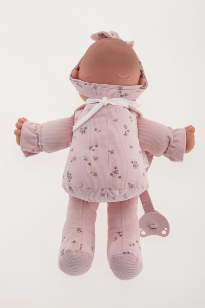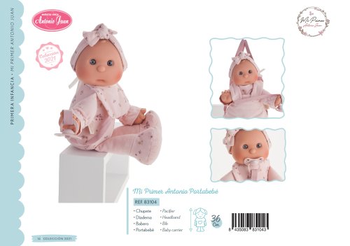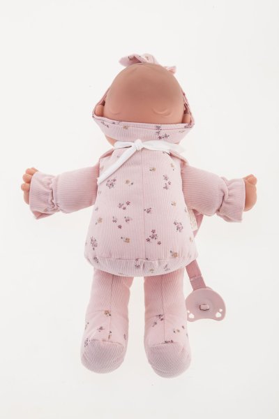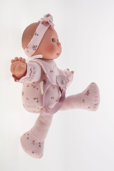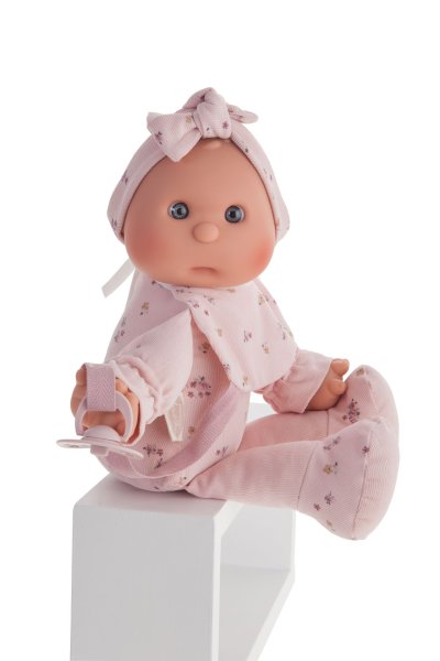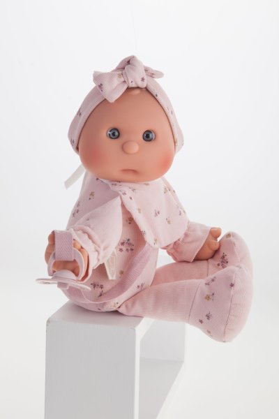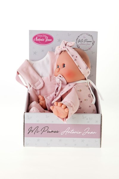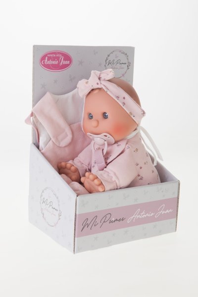 Ručne vyrobená španielska bábika špeciálne pre batoľatá s cumlíkom na magnet. Bábika má mäkké látkové telo, hlava a končatiny sú vyrobené z kvalitného mäkčeného vinylu. Oblečenie niektorých bábik bolo vyrobené z organickej bavlny, ktorá zaručuje výrobu z ručne zbieranej, ekologicky bez chemického ošetrenia pestovanej bavlny. Firma Antonio Juan kladie veľký dôraz na ekológiu a preto ako prvá využíva v tomto odvetví spomínanú bavlnu. Veľkosť 36 cm. Balené v darčekovej krabici. Odporúčaný vek od 18 mesiacov.