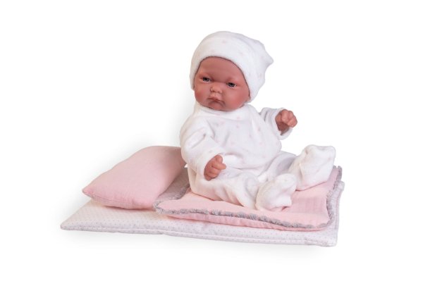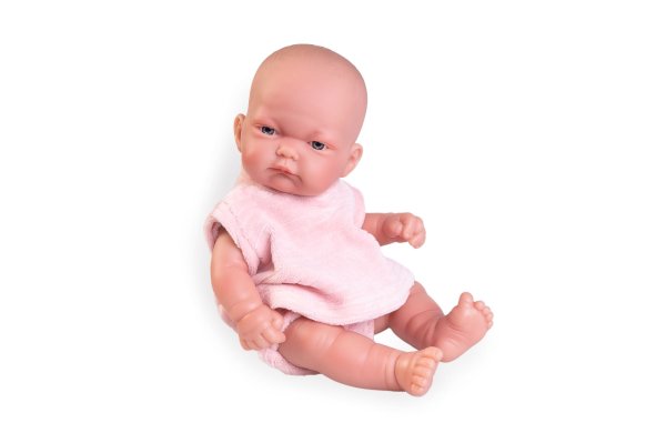 Ručne vyrobená realistická španielska bábika - bábätko new born s celovinylovým telom a realistickým vyobrazením rôznych bábätkovských faldíkov a detailov vrátane pohlavia. Bábika je vyrobená zo špeciálneho mäkčeného vinylu, veľmi príjemného na dotyk. Bábätko je možné kúpať. Oblečenie niektorých bábik bolo vyrobené z organickej bavlny, ktorá zaručuje výrobu z ručne zbieranej, ekologicky bez chemického ošetrenia pestovanej bavlny. Firma Antonio Juan kladie veľký dôraz na ekológiu a preto ako prvá využíva v tomto odvetví spomínanú bavlnu. Veľkosť 26 cm. Balené v darčekovej krabici. Odporúčaný vek od 2 rokov.