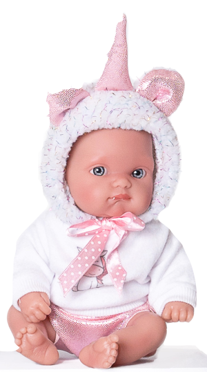 Ručne vyrobená realistická španielska bábika - bábätko new born s celovinylovým telom a realistickým vyobrazením rôznych bábätkovských faldíkov a detailov vrátane pohlavia. Bábika je vyrobená zo špeciálneho mäkčeného vinylu, veľmi príjemného na dotyk. Bábätko je možné kúpať. Oblečenie niektorých bábik bolo vyrobené z organickej bavlny, ktorá zaručuje výrobu z ručne zbieranej, ekologicky bez chemického ošetrenia pestovanej bavlny. Firma Antonio Juan kladie veľký dôraz na ekológiu a preto ako prvá využíva v tomto odvetví spomínanú bavlnu. Veľkosť 21 cm. Balené v ochrannom igelitovom obale. Odporúčaný vek od 3 rokov.