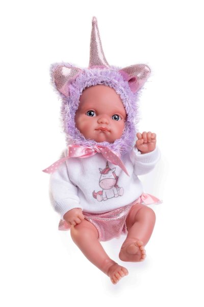 Ručne vyrobená realistická španielska bábika - bábätko new born s celovinylovým telom a realistickým vyobrazením rôznych bábätkovských faldíkov a detailov vrátane pohlavia. Bábika je vyrobená zo špeciálneho mäkčeného vinylu, veľmi príjemného na dotyk. Bábätko je možné kúpať. Oblečenie niektorých bábik bolo vyrobené z organickej bavlny, ktorá zaručuje výrobu z ručne zbieranej, ekologicky bez chemického ošetrenia pestovanej bavlny. Firma Antonio Juan kladie veľký dôraz na ekológiu a preto ako prvá využíva v tomto odvetví spomínanú bavlnu. Veľkosť 21 cm. Balené v ochrannom igelitovom obale. Odporúčaný vek od 3 rokov.