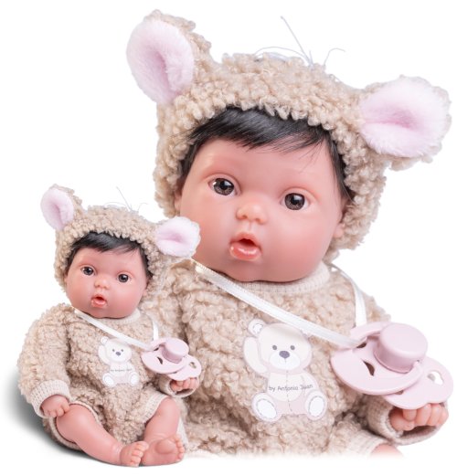 Ručne vyrobená realistická španielska bábika - bábätko new born s celovinylovým telom a realistickým vyobrazením rôznych bábätkovských faldíkov a detailov vrátane pohlavia. Bábika je vyrobená zo špeciálneho mäkčeného vinylu, veľmi príjemného na dotyk. Oblečenie niektorých bábik bolo vyrobené z organickej bavlny, ktorá zaručuje výrobu z ručne zbieranej, ekologicky bez chemického ošetrenia pestovanej bavlny. Firma Antonio Juan kladie veľký dôraz na ekológiu a preto ako prvá využíva v tomto odvetví spomínanú bavlnu. Veľkosť 21 cm. Odporúčaný vek od 2 rokov.
