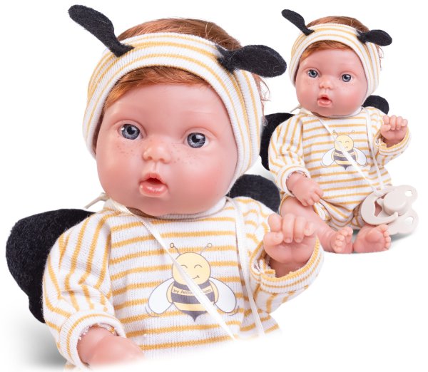 Ručne vyrobená realistická španielska bábika - bábätko new born s celovinylovým telom a realistickým vyobrazením rôznych bábätkovských faldíkov a detailov vrátane pohlavia. Bábika je vyrobená zo špeciálneho mäkčeného vinylu, veľmi príjemného na dotyk. Oblečenie niektorých bábik bolo vyrobené z organickej bavlny, ktorá zaručuje výrobu z ručne zbieranej, ekologicky bez chemického ošetrenia pestovanej bavlny. Firma Antonio Juan kladie veľký dôraz na ekológiu a preto ako prvá využíva v tomto odvetví spomínanú bavlnu. Veľkosť 21 cm. Odporúčaný vek od 2 rokov.