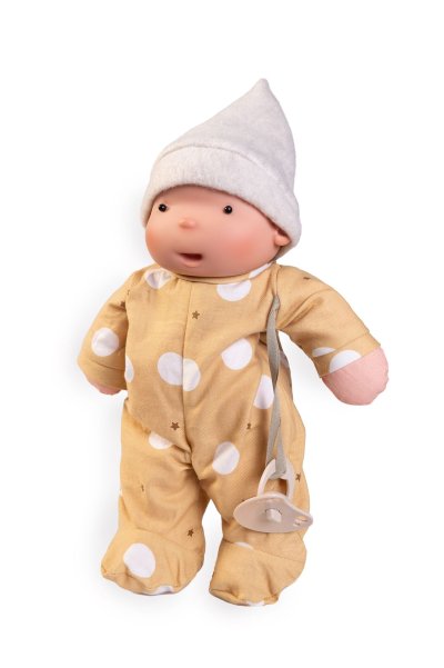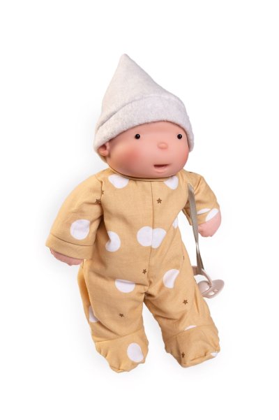 Ručne vyrobená španielska organická bábika s cumlíkom na magnet a mäkkým látkovým telom, vytvorená špeciálne pre dojčatá a batoľatá. Telo a končatiny sú vyrobené z organickej bavlny, hlava zo 100% silikónu. Bábika je plnená mäkkým PET vláknom z recyklovaných plastových fliaš. Cumlík je vyrobený z bio organických materiálov s prírodnými pigmentmi. Oblečenie tejto bábiky bolo vyrobené z organickej bavlny, ktorá zaručuje výrobu z ručne zbieranej, ekologicky bez chemického ošetrenia pestovanej bavlny. Firma Antonio Juan kladie veľký dôraz na ekológiu a preto ako prvá využíva v tomto odvetví spomínanú bavlnu. Veľkosť 26 cm. Balené v darčekovej krabici. Odporúčaný vek od 10 mesiacov.