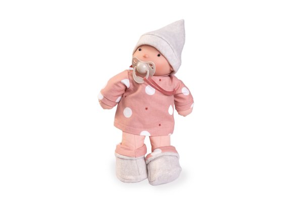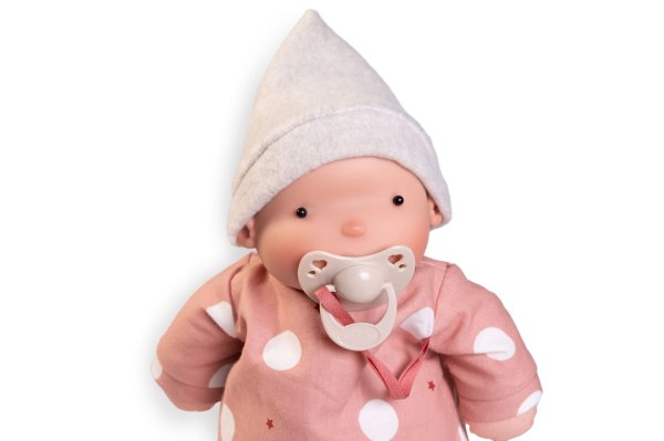 Ručne vyrobená španielska organická bábika s cumlíkom na magnet a mäkkým látkovým telom, vytvorená špeciálne pre dojčatá a batoľatá. Telo a končatiny sú vyrobené z organickej bavlny, hlava zo 100% silikónu. Bábika je plnená mäkkým PET vláknom z recyklovaných plastových fliaš. Cumlík je vyrobený z bio organických materiálov s prírodnými pigmentmi. Oblečenie tejto bábiky bolo vyrobené z organickej bavlny, ktorá zaručuje výrobu z ručne zbieranej, ekologicky bez chemického ošetrenia pestovanej bavlny. Firma Antonio Juan kladie veľký dôraz na ekológiu a preto ako prvá využíva v tomto odvetví spomínanú bavlnu. Veľkosť 26 cm. Balené v darčekovej krabici. Odporúčaný vek od 10 mesiacov.