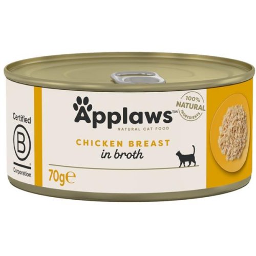 Konzerva Applaws je ľahko stráviteľné, nutrične vysoko hodnotné, prirodzene bezlepkové, hypoalergénne a hlavne veľmi chutné kŕmenie! 100% prírodné krmivo bez umelých konzervačných látok, farbív alebo dochucovadiel. Kvalitu spoznáte na prvý pohľad po otvorení konzervy: prirodzená konzistencia trhaného mäsa z kuracích pŕs v lahodnom kuracom vývare vás presvedčí a vašu mačku nadchne. Mäso pochádza z kurčiat, ktoré sú chované vo voľných výbehoch, kŕmené prirodzene bez použitia hormónov a antibiotík, sú zdravé av potravinárskej kvalite. Zloženie: 75% kuracie prsia, kuracie vývar, ryža. Analytické zložky: hrubý proteín 16%, hrubé oleje a tuky 1%, hrubý popol 1%, hrubá vláknina 0,1%, vlhkosť 80%. Metabolizovateľná energia: 828 kcal/kg (58 kcal v 70g balení) Dávkovanie: Kŕmte až 2 konzervy denne v závislosti od veľkosti mačky. Odporúčané dávkovanie je iba orientačné, potreba je individuálna a závisí od veku, množstva pohybu a životného prostredia mačky. Podávajte ako spestrenie ku kompletnej vyváženej strave, ideálne ku granulám Applaws. Podávajte pri izbovej teplote a po otvorení uchovávajte v chladničke. Mačka by mala mať vždy prístup k čerstvej pitnej vode.