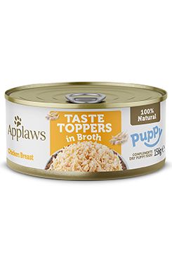 Doplnkové krmivo Taste Toppers pre šteňatá od dvoch mesiacov veku. Konzervy Applaws pre psov obsahujú iba čisté mäso v celých kúskoch! Žiadne náhradky a imitácia mäsových kúskov. Na výrobu tejto konzervy sa používajú iba tie najjemnejšie kúsky kuracích pŕs, teda vysoko kvalitné bielkoviny pre podporu rastu a vývoja vášho šteňaťa. Trhané kúsky kurčaťa, špeciálne vyrobené pre šteňatá s vyvíjajúcimi sa zubami a ďasnami. Kurčatá sú z voľných výbehov a sú kŕmené výhradne organickým krmivom bez použitia hormónov.