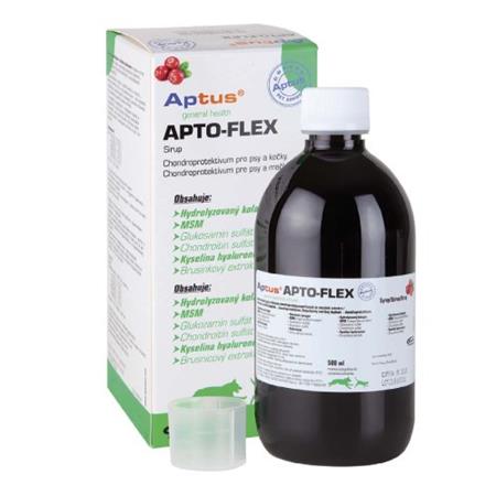 Aptus APTO-FLEX VET sirup je unikátne päťzložkové solubilné chondroprotektívum s kyselinou hyalurónovou a antioxidantmi pre psy a mačky. Brusnicový extrakt obsahuje vitamín E, ale navyše obsahuje vitamíny B, C, K, množstvo minerálov, sú známe jeho antioxidačné a protinádorové účinky, a je používaný aj pri infekciách močových, orálnych a gastrointestinálnych. Indikácie: Výživa a regenerácia chrupaviek a väzov v kĺboch. Zloženie: Kyselina hyalurónová, MSM, kolagén, glukosamín sulfát, chondroitín sulfát a antioxidanty (brusnicový extrakt). Preventívne podávanie: u veľkých a ťažkých plemien psov, u športujúcich psov, pri obezite, u starších zvierat, u šteniat rýchlo rastúcich plemien psov - výživa, ochrana a regenerácia chrupaviek a väzov v kĺboch, zlepšenie pohyblivosti, prevencia artritídy. Terapeutické podávanie: Po chirurgických ortopedických zákrokoch, pri dyspláziách kĺbov, pri osteoartritíde, pri bolestivosti pohybového systému - zrýchlenie a uľahčenie hojenia, zníženie bolestivosti pri pohybe, uľahčenie pohyblivosti kĺbov, spomalenie progresie artrózy.