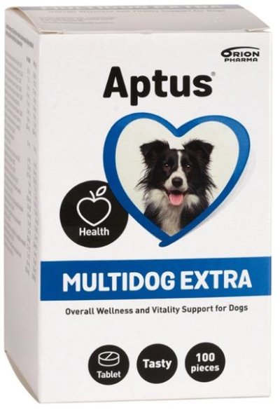 Aptus Multidog Extra Vet je vhodný ako doplnok stravy na podporu celkového zdravia a vitality vášho psa. Doplní nevyhnutné množstvo vitamínov, minerálov, stopových prvkov a aminokyselín a celkovo posilní organizmus. Je preto vhodný pre psov napríklad v období rekonvalescencie, pri kŕmení doma pripravovanou stravou, alebo pri hypoalergénnej a eliminačnej diéte. Vitamíny sú vo forme ochutených tabliet. Zloženie: pivovarské kvasnice, želatína (bravčová), stearát horečnatý (1,35%). Analytické zložky: hrubý proteín 30,2 %, surové oleje a tuky 1,3 %, hrubá vláknina 7,3 %, anorganická látka 30 %, vápnik 1,4 mg/g, nátrium 5,5 mg/g, fosfor 7, 7 mg/g, horčík 2,2 mg/g. Technologické doplnkové látky: mikrokryštalická celulóza. Senzorické doplnkové látky: aromatická zložka (pečeň) 0,04 %. Podávanie: Tablety Aptus Multidog Extra s príchuťou pečene môžu byť podávané priamo do papule ako maškrta. Môžete ich tiež rozdrviť a zamiešať do kŕmenia. Niekedy môže Váš pes potrebovať každodennú suplementáciu multivitamínom aj vtedy, keď žerie nedostatočne. Pri kŕmení doma pripravovaným kŕmením je pridávanie multivitamínového doplnku stravy nevyhnutné na dosiahnutie správnej nutričnej hodnoty krmiva. Multivitamínový doplnok stravy potrebujú často aj chorí a stresované psy v priebehu rekonvalescencie. Aptus Multidog Extra je multivitamínový doplnok stravy na každodenné používanie na podporu celkového zdravia a vitality Vášho psa. Dávkovanie: 1 tableta na 20 kg hmotnosti psa 1-krát denne. V prípade zvýšenej potreby 2 tablety na 20 kg hmotnosti 1-krát denne po dobu 2 týždňov. Dôležité upozornenie: Tento prípravok obsahuje vitamíny A, D, a E, ktoré sú rozpustné v tukoch a môžu sa zhromažďovať v organizme. Ak dávate Vášmu psovi multivitamín, je potrebné pri kŕmení počítať s vitamínmi A, D, a E v ňom obsiahnutými. Ak máte obavy o zdravie svojho psa, kontaktujte svojho veterinára. Dátum spotreby je vyznačený na obale. Uchovávajte pri izbovej teplote (15 - 25°C). Uchovávajte mimo dosahu detí a zvierat.