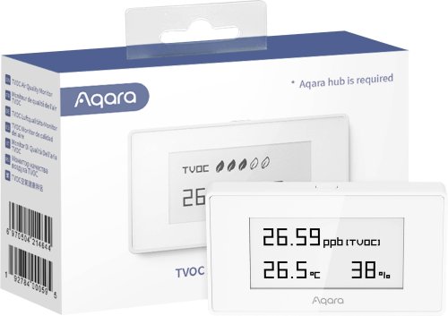 Monitor kvality vzduchu Aqara TVOC zmeria teplotu, vlhkosť a hladinu TVOC vo vzduchu. Na fungovanie nutný Aqara HUB, E Ink displej, ZigBee 3.0, podpora Apple HomeKit, výdrž batérie až 1 rok.