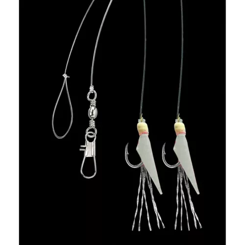 Morský náväzec s dvoma háčikmi veľkosť 12 potiahnutými pravou rybou kožou v prírodnej farbe natural . Ideálna pre lov menších morských rýb, kedy ryby reagujú na prirodzený vzhľad. Hlavný vlasec 0,35 mm, príves 0,30 mm, dĺžka 150 cm, nosnosť 6 kg.