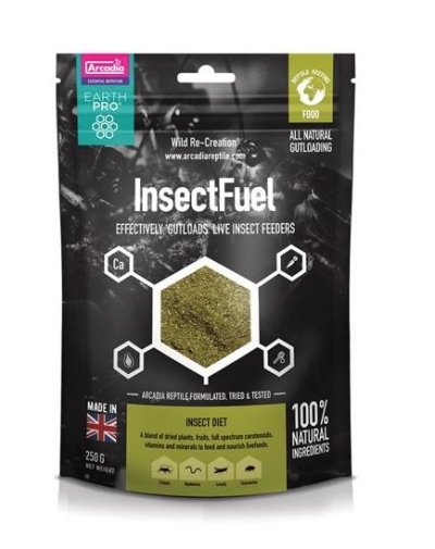 Arcadia EarthPRO-Insect Fuel má svoj základ vo lucerne, pestovanej a zberanej v Anglicku, obohatenej o plné spektrum vitamínov, minerálov a včelieho peľu.