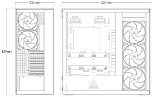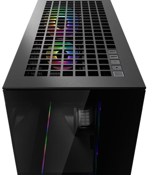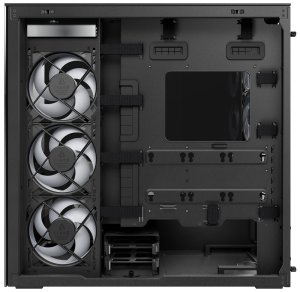 Skriňa je vybavená celkom 5 A-RGB ventilátormi - dvoma 120mm vzadu a tromi 140mm na boku, ktoré zaisťujú optimálne chladenie aj pri vysokom zaťažení. Priestranný interiér pojme grafické karty až 482 mm , CPU chladiča do výšky 171 mm a zdroje až 318 mm .
