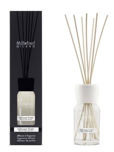 Aróma difuzér Natural Kvety z bieleho papiera je svieža a napriek tomu upokojujúca vôňa, ktorá prináša do domova žiarivú atmosféru šťastia. Čistá vôňa zelených čajových lístkov a bergamotu sa mieša s nehou bielych kvetov a biele drevo v základe dodáva celej kompozícii zamatový dotyk pokoja. Sklenená fľaštička je zakončená elegantným keramickým krúžkom. Po vyprchaní vône možno jednoducho kúpiť iba náplň a po vymytí fľaštičky doplniť ľubovoľnou vôňou.
