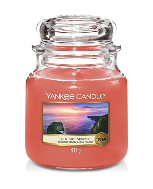 Aromatická sviečka strednej Cliffside Sunrise evokuje teplý vánok s vôňou exotického ovocia a kvetov.