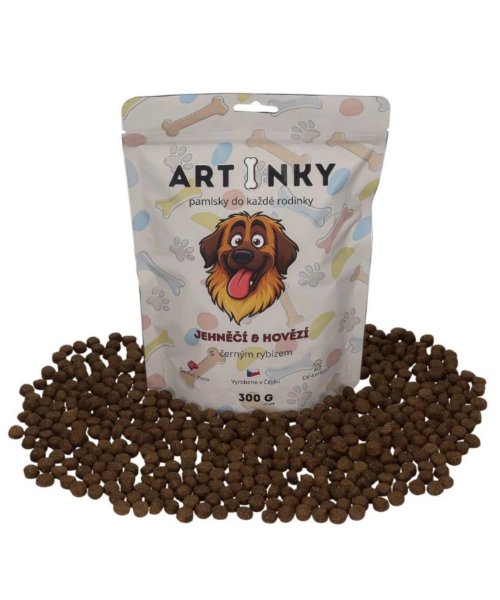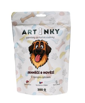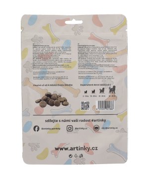 ARTINKY sú polomäkké maškrty pre psov vyrobené v Českej republike. ARTINKY predstavujú kvalitné doplnkové krmivo pre psov, ktoré spája vysoký podiel živočíšnych surovín , jednoduché zloženie a skvelú chuť. Receptúra kombinuje jahňacie a hovädzie mäso, jemné zdroje vlákniny a čierne ríbezle pre podporu vitality a imunity.