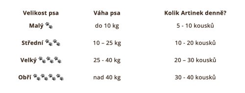 Odporúčané podávanie : Podávaj ako pochúťku alebo odmenu pri výcviku. Denné množstvo prispôsob veľkosti, veku a aktivite psa. Odporúčané dávkovanie viď tabuľka. Nie je náhradou za kompletné krmivo. Vždy zaisti dostatok čerstvej pitnej vody.