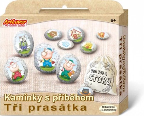 Všetky kamienky najprv umy a nechaj uschnúť. Odstráň fóliu zo zadnej strany prenosovej samolepky. Samolepku umiestni zadnou stranou tam, kde chceš mať obrázok. Pomocou špachtle obrázok prenes na kamienok. Poriadne pritlač a snaž sa samolepkou nehýbať. Ak je obrázok prenesený, veľmi opatrne snímaj už prázdnu časť samolepky. Prenesený obrázok ešte jednu opatrne uhlaď. Kamienky sú hotové! Pokús sa podľa nich rozprávať príbeh. Budeš potrebovať nožnice. Obsahuje: 10 kamienkov, 2 archy prenosových samolepiek, 1 špachtľa, 1 bavlnené vrecko.