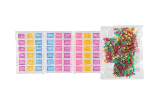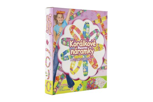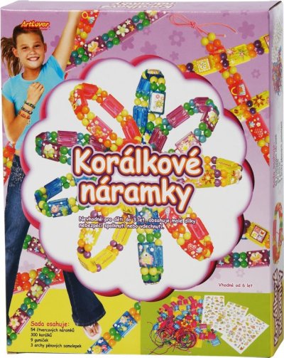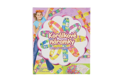 Obsahuje 54 štvorcových náramkov, 300 korálikov, 9 gumičiek, 3 archy penových samolepiek.
