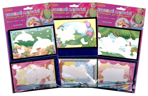 Do ceruzky nalejte vodu a maľujete s ňou na obrázok, obrázok sa po použití vody objaví a až voda zaschne - zase zmizne a môžete maľovať znova. Môžete použiť aj obyčajný štetec a kelímok s vodou - je to pre nich naozaj zábava a pre rodičov tiež, pretože vodou sa nič neušpiní ako s farbami ... Veľkosť obrázku 15 x 10 cm. Súprava obsahuje 2 obrázky.