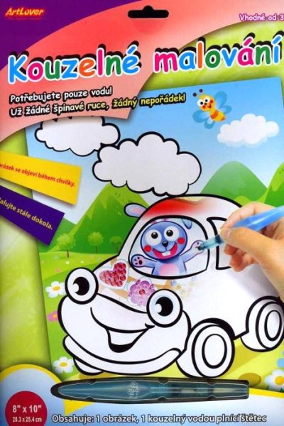 Kúzelné maľovanie vodou zabaví aj tých najmenších výtvarníkov. Potrebujete iba vodu. Vďaka obrázkom potiahnutým špeciálnou bielou vrstvou, ktorá po navlhčení zmizne, vykúzlite rozmanité obrázky, ktoré žiaria všetkými farbami. Akonáhle obrázok uschne (za niekoľko minút), opäť sa pokryje bielou farbou - môžete tak maľovať stále znova a znova...