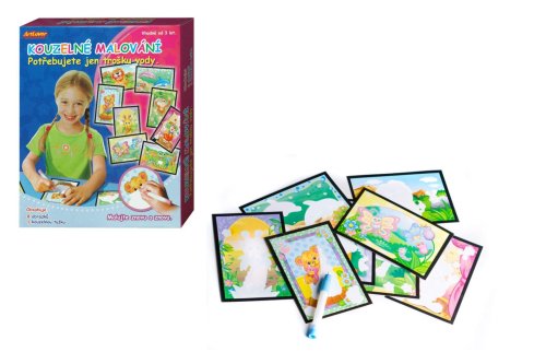 Sada obsahuje 8 kúzelných obrázkov. Do ceruzky nalejte vodu a maľujete s ňou na obrázok, obrázok sa po použití vody objaví a až voda zaschne -cca 3 minúty zase zmizne a môžete maľovať znova. Menšie deti môžu používať obyčajný štetec a kelímok s vodou - je to pre nich naozaj zábava a pre rodičov tiež, pretože vodou sa nič neušpiní ako s farbami ... Vhodné pre deti už od 3 rokov.