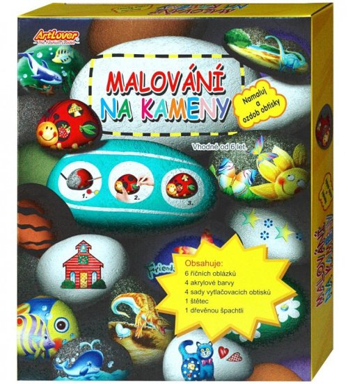 Postup: Ceruzkou načrtnite obrázok a namaľujte farbami. Po zaschnutí farieb ozdobte obtlačky. Odstráňte z obtlačkov ochrannú fóliu a špachtľou obtlačky vytlačte na kameň.