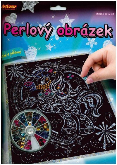 Odstráňte ochrannú fóliu z podkladového obrázku. Nalepujte jednotlivé perličky do predtlačených miest. Perly vyberajte tak, aby ich veľkosť zodpovedala veľkosti predtlačených miest na obrázku.