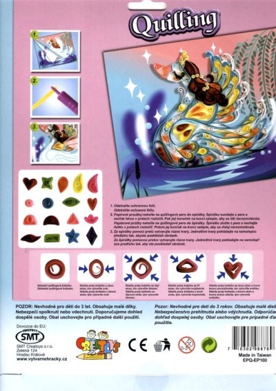 Odstráňte ochrannú fóliu. Papierové prúžky natočte na quillingové pero do špirálok. Špirálku zložte z pera a nechajte ľahko v prstoch povoliť (rozvinúť). Potom jej konček na konci zlepte, aby sa ďalej nerozmotávala. Zo špirály pomocou prstov vytvarujte rôzne tvary. Jednotlivé tvary pokladajte na samolepiacu predlohu tak, aby ste poskladali obrázok.
