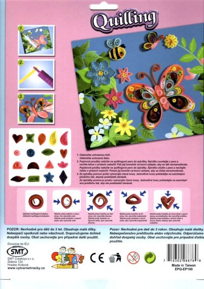Odstráňte ochrannú fóliu. Papierové prúžky natočte na quillingové pero do špirálok. Špirálku zložte z pera a nechajte ľahko v prstoch povoliť (rozvinúť). Potom jej konček na konci zlepte, aby sa ďalej nerozmotávala. Zo špirály pomocou prstov vytvarujte rôzne tvary. Jednotlivé tvary pokladajte na samolepiacu predlohu tak, aby ste poskladali obrázok.