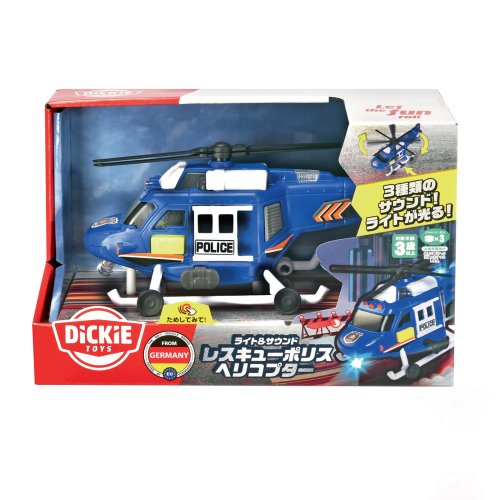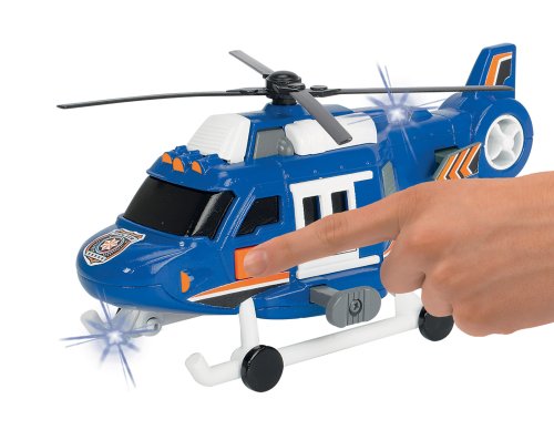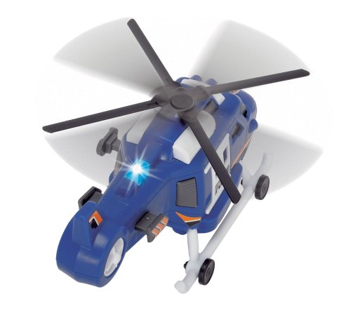 Policajný vrtuľník so zvukovým a svetelným efektom, na voľnobeh. Manuálne ovládaný navijak, pohyblivý rotor. Dĺžka 18 cm.