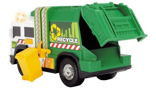 Smetiarske auto zelené na voľnobeh, s manuálnou funkciou zdvíhania smetiaka. Zvukové a svetelné efekty, otvárací zadný panel. Popolnice súčasťou. Pochrómované diely. Dĺžka 30 cm.
