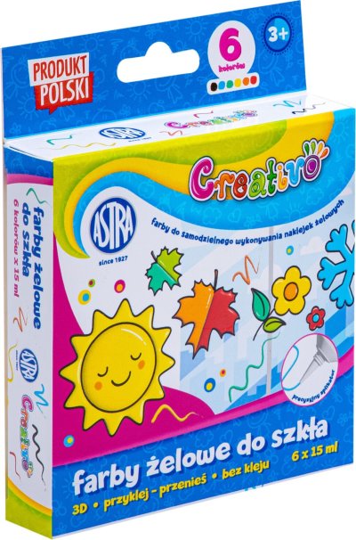 Gélové farby ASTRA CREATIVO pre vytváranie vitráží, po zaschnutí sa vytvorí statická gélová "nálepka", ktorú je možné prenášať.