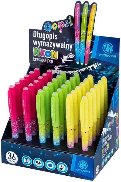 Obsahuje špeciálny atrament, ktorý sa dá zmazať oboma koncami pera. Pero je vyrobené zo špeciálneho protišmykového plastu a má modrú vymeniteľnú náplň. Šírka stopy: 0,6mm.