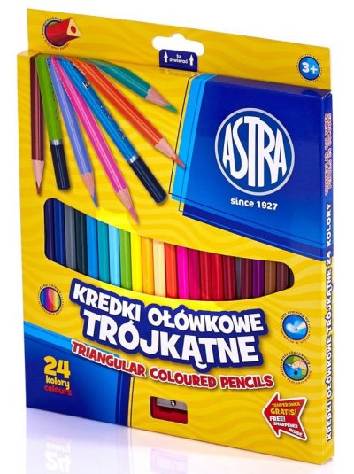 Súprava 24 kusov ergonomických pasteliek Astra a strúhadla. Pastelky majú mäkkú odolnú tuhu a ľahko sa orezávajú. Trojhranný tvar uľahčuje deťom ich držanie.