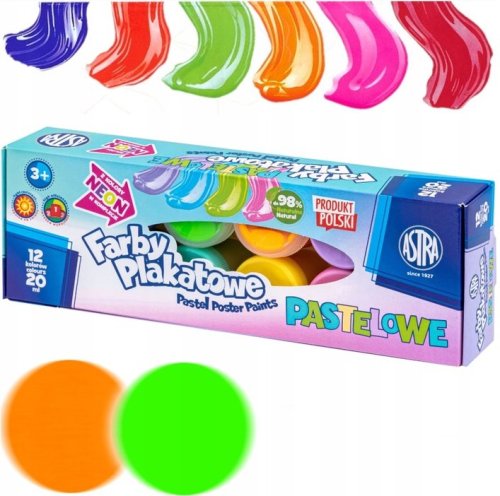 Sada 12 pastelových farieb po 20 ml v praktických plastových téglikoch s viečkom. Dve farby sú v neónových tónoch. Jemné a decentné odtiene - vhodné pre rôzne výtvarné techniky a kreatívne tvorenie. Vodou riediteľné farby – ľahko sa nanášajú, miešajú a čistia. Vysoká krycia schopnosť vďaka kvalitným jemne mletým pigmentom. Matný povrch po zaschnutí a odolnosť voči svetlu zaručujú trvanlivý výsledok. Vhodné na papier a podobné výtvarné povrchy – ideálne na školské aj domáce použitie.