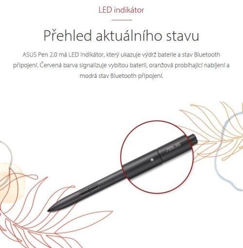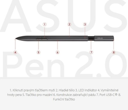 Aktívne dotykové pero ASUS Pen 2.0 je ideálne na písanie poznámok či kreslenie na dotykovom displeji. Pracuje s technológiou MPP 2.0 , ktorá ponúka veľmi krátku latenciu a rýchlu odozvu. Citlivosť až 4096 úrovní tlaku a sila hrotu pera 5 až 350 g vám umožní zaznamenať najjemnejšie línie aj široké ťahy štetcom. Stylus podporuje párovanie cez Bluetooth pomocou jedného kliknutia a ponúka niekoľko prednastavených skratiek pre jednoduchšie ovládanie. Funkčné tlačidlá zahŕňajú jedno horné tlačidlo pre klávesové skratky a dve bočné tlačidlá určené na klikanie myšou a mazanie. Nabíjanie je riešené pomocou USB-C konektora pre rýchle nabitie za 30 minút, ktoré zaistia viac ako 140 hodín prevádzky.
