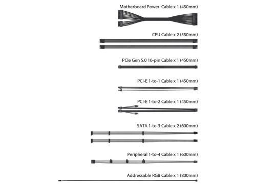 Obsah balenia *Napájací kábel x 1 *Napájací kábel základnej dosky x 1 (450 mm) *Kábel procesora x 2 (550 mm) *Kábel PCI-E Gen 5 16-pin x 1 (450 mm) *Kábel PCI-E 1- do-1 x 1 (450 mm) *Kábel PCI-E 1-do-2 x 1 (450 mm) *Kábel SATA 1-na-3 x 2 (300+200+100mm) *Periférny kábel 1-na-4 x 1 (300+100+100+100mm) *Adresovateľný kábel RGB x 1 (800 mm) *Užívateľská príručka x 1 *Držiak adaptéra ATX na SFX x 1