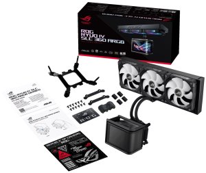 Predinštalované prepojené ARGB ventilátory umožňujú napájanie osvetlenia a motora jediným káblom. Balenie obsahuje kompletné montážne príslušenstvo pre všetky podporované sockety, ROG VIP kartu a samolepku.