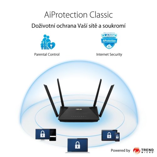 RT-AX53U obsahuje ASUS AiProtection, komerčný sieťový bezpečnostný systém poháňaný Trend Micro Smart Home Network. Vďaka AiProtection sú všetky pripojené zariadenia chránené, aj keď nemajú žiadnu vlastnú antivírusovú schopnosť – ako sú zariadenia IoT. AiProtection blokuje bežné internetové útoky skôr, ako sa dostanú do siete, a pokiaľ je v sieti detekované infikované zariadenie, AiProtection ho okamžite zablokuje, aby zabránil odosielaniu akýchkoľvek osobných informácií na škodlivé servery.