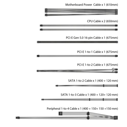 Intel Form Factor: ATX12V ATX 3.0: áno Rozmery: 150 x 150 x 86 mm Účinnosť: 80Plus Gold Ochrana: OPP/OVP/UVP/SCP/OCP/OTP AC rozsah vstupného napätia: Full Range (100-240Vac) DC výstupné napätie: +3.3V +5V +12V -12V +5Vsb Maximálna záťaž: 25A25A62A 0.8A 3A Kombinovaná záťaž: 130W 130W 744W 9.6W 15W Celkový výkon: 750W Konektory: *MB 24/20 2 *PCI-E 16-pin x 1 *PCI-E 8-pin x 3 *SATA x 5 *PERIPHERAL x 4 Obsah balenia: *Power Cord x 1 *Motherboard Power Cable x 1 (610mm) *CPU Cable x 2 ( 650mm) *PCI-E Gen 5 16-pin Cable x 1 (675mm) *PCI-E 1-to-1 Cable x 1 (675mm) *PCI-E 1-to-2 Cable x 1 (675mm) *SATA 1 -to-2 Cable x 1 (400+120mm) *SATA 1-to-3 Cable x 1 (400+120+120mm) *Peripheral 1-to-4 Cable x 1 (400+150+150+150mm) *TUF Gaming Cable tie x 3 *User Manual x 1