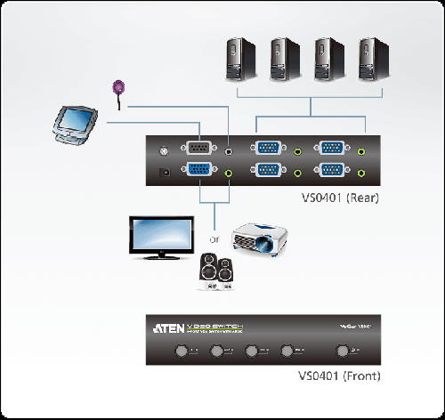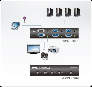 Prepínač umožní pripojiť 4 zdroje signálov VGA a audia a prepínať ich na 1 zobrazovaciu jednotku (monitor). Zariadenie je vhodné napr. na prezentácie alebo do výcvikových objektov. Zariadenie má vstavaný RS-232 port pre ovládanie počítačom alebo high-end zariadeniami.
