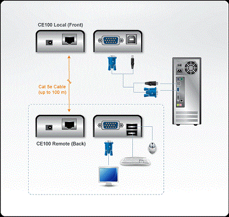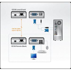 CE100 USB KVM Extender s vynikajúcou kvalitou obrazu a zabudovanou ochranou ESD umožňuje prístup k počítačovému systému zo vzdialenej konzoly USB (klávesnica USB, myš USB a monitor).