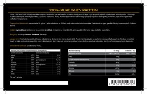 rozmiešajte 30 g (cca 1 plná odmerka alebo 2 polievkové lyžice) v 250-300 ml vody alebo mlieka užívajte ihneď po tréningu alebo počas dňa na doplnenie optimálneho množstva bielkovín Tabuľka nutričných hodnôt: