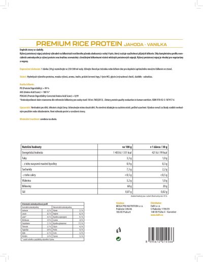 Vysoko kvalitný ryžový proteínový koncentrát doplnený o voľný l-lyzín. Proteínový nápoj obsahuje 70% bielkovín výhradne z ryže, je prirodzene bez lepku a laktózy a neobsahuje umelé farbivá. Vďaka kompletnému profilu esenciálnych aminokyselín je ryžový proteín svojou kvalitou porovnateľný so živočíšnymi bielkovinami vrátane mliečnych proteínových nápojov. Aminokyselinové spektrum doplnené o voľný l-lyzín Ryžová bielkovina má prirodzene nízky obsah l-lyzínu, čím klesá celková využiteľnosť bielkoviny pre ľudský organizmus. V receptúre PREMIUM RICE PROTEINu je preto l-lyzín pridaný vo voľnej forme, aby zastúpenie esenciálnych aminokyselín bolo plnohodnotné. Vďaka vysokej proteínovej stráviteľnosti sa tak proteínový nápoj môže pýšiť vynikajúcim skóre kvality bielkovín (PDCAAS = 0,99), ktoré zodpovedá tým najkvalitnejším proteínovým nápojom na trhu. Ryžový proteínový nápoj je vhodný pre vegetariánov a vegánov.