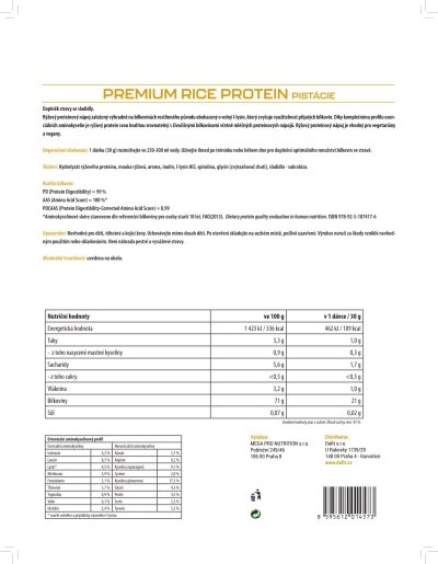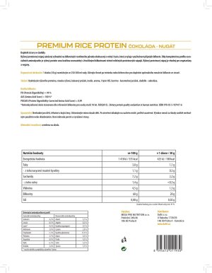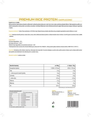 Vysoko kvalitný ryžový proteínový koncentrát doplnený o voľný l-lyzín. Proteínový nápoj obsahuje 70% bielkovín výhradne z ryže, je prirodzene bez lepku a laktózy a neobsahuje umelé farbivá. Vďaka kompletnému profilu esenciálnych aminokyselín je ryžový proteín svojou kvalitou porovnateľný so živočíšnymi bielkovinami vrátane mliečnych proteínových nápojov. Aminokyselinové spektrum doplnené o voľný l-lyzín Ryžová bielkovina má prirodzene nízky obsah l-lyzínu, čím klesá celková využiteľnosť bielkoviny pre ľudský organizmus. V receptúre PREMIUM RICE PROTEINu je preto l-lyzín pridaný vo voľnej forme, aby zastúpenie esenciálnych aminokyselín bolo plnohodnotné. Vďaka vysokej proteínovej stráviteľnosti sa tak proteínový nápoj môže pýšiť vynikajúcim skóre kvality bielkovín (PDCAAS = 0,99), ktoré zodpovedá tým najkvalitnejším proteínovým nápojom na trhu. Ryžový proteínový nápoj je vhodný pre vegetariánov a vegánov.