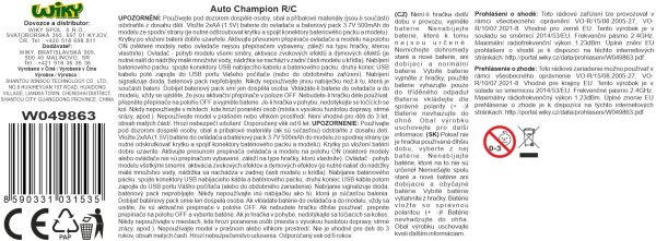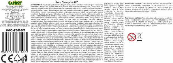 Auto 62 Champion svietiaci dymiaci RC na diaľkové ovládanie. Rozmery 19x8x6 cm. Frekvencia 2.4GHz. Svetelné efekty povrchu auta. Fajčiace efekty. Batériový pack 3.7V 500mAh do auta súčasťou, 2xAA do ovládača nie sú súčasťou. USB kábel súčasťou. Prepínač ON/OFF na spodnej strane obalu. Ovládač - prepínač ON/OFF, tlačidlo - dymiace efekty, tlačidlo - zvukové efekty. Nádržka na vodu v zadnej časti auta pred krídlom.