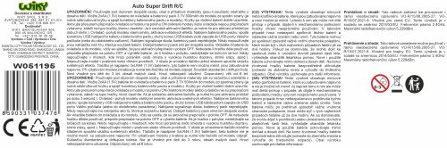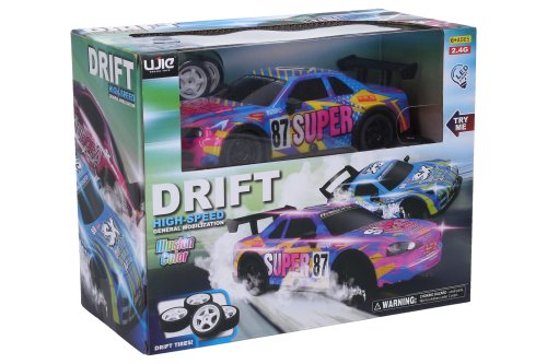 Auto 87 Super driftujúce svietiace RC na diaľkové ovládanie. Rozmery 20x8x6 cm. Frekvencia 2.4GHz. Pištoľový ovládač. Súčasťou 4 štandardné a 4 driftujúce kolesá. Svetelné efekty povrchu auta tlačidlom na ovládači. Batériový pack 3.7V 500mAh lítium do auta súčasťou, 2xAA do ovládača nie sú súčasťou. Try Me tlačidlo pre svetelné efekty v obale - 3xAG13 batérie (nemeniteľné) súčasťou. Pri vybaľovaní je nutné odpojiť Try Me kábel z auta. USB kábel súčasťou. Rýchlosť 12 km/h. Prevádzka až 20 min, nabíjanie 2 h, dosah až 40 m. Prepínač ON/OFF na spodnej strane auta a na ovládači.
